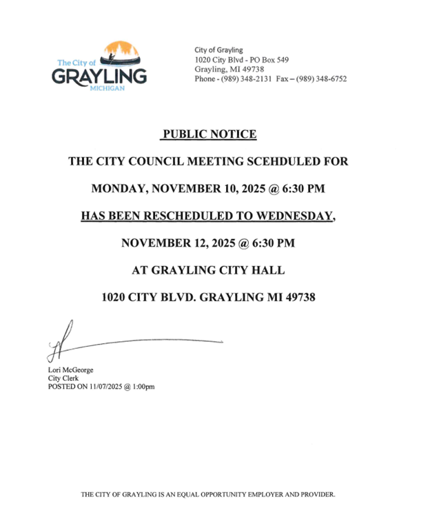 HAS BEEN RESCHEDULED TO WEDNESDAY, NOVEMBER 12, 2025 @ 6:30 PM AT GRAYLING CITY HALL